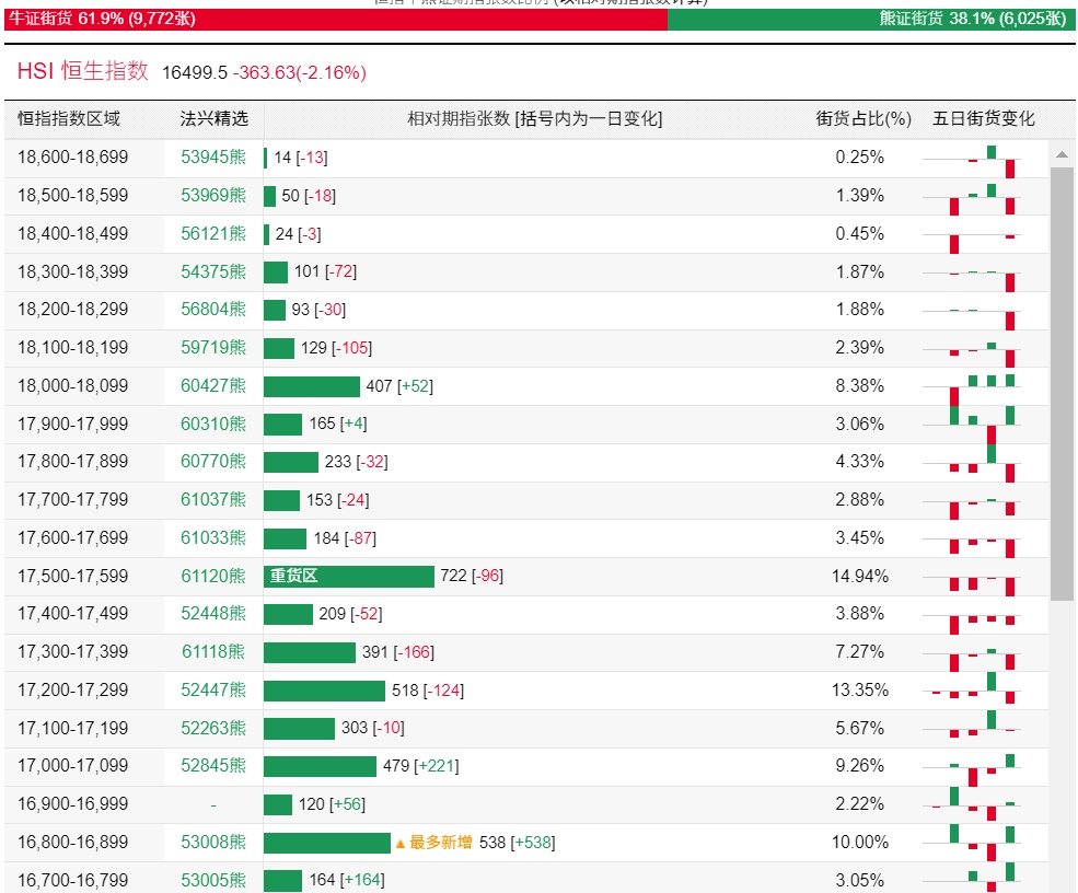 法兴恒指牛熊证街货分布图中的数据显示,熊证街货重货区在17500-17599区间,该区间最新熊证数量为722张,较上一交易日减少96张;最多新增在16800-16899区间,该区间最新熊证数量为538张,较上一交易日增加538张。