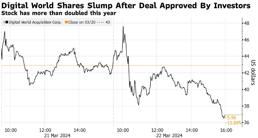 DWAC股价周五下跌14%,创下今年1月以来最大跌幅,在批准合并如期通过后,抹去了此前12%的涨幅。与SPAC挂钩的权证下跌6.3%,至18.37美元。该SPAC的股价今年已经翻了一倍多,因为投资者把它作为押注特朗普竞选连任的一种方式。自该交易于2021年宣布以来,该股一直是散户人群的最爱,Stocktwits和Reddit Inc.的WallStreetBets论坛上的帖子鼓励人们购买该股。