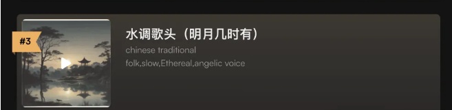 Suno AI的官方网站上已经展示了不少用户提交的AI生成的歌曲,其中包括根据“中国传统民乐、慢板、空灵、天使之音”提示词生成的“全新版”《水调歌头(明月几时有)》,以及一首以“歌剧”为提示词生成的歌曲——《宫保鸡丁》,其歌词竟然是一份完整的菜谱。