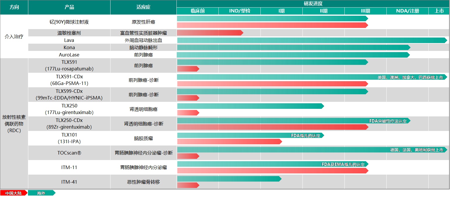 目前,公司已有4款创新RDC药物在国内获批开展临床研究,其中3款已进入III期临床阶段,包括诊断前列腺癌的产品TLX591-CDx、诊断透明细胞肾细胞癌产品 TLX250-CDx,以及治疗GEP-NETs的产品ITM-11。远大医药已成为拥有进入国内III期临床的诊断和治疗类创新RDC药物储备最多的企业,也是全球核药抗肿瘤领域拥有最丰富产品管线和诊疗一体化布局的创新药企之一。