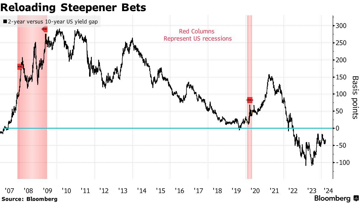 值得一提的是,尽管美债收益率曲线在美联储上周公布利率决议后短期趋陡,但2年期美债收益率仍比10年期美债收益率高出约40个基点,自2022年年中以来,2/10年期收益率曲线便一直是倒挂的。