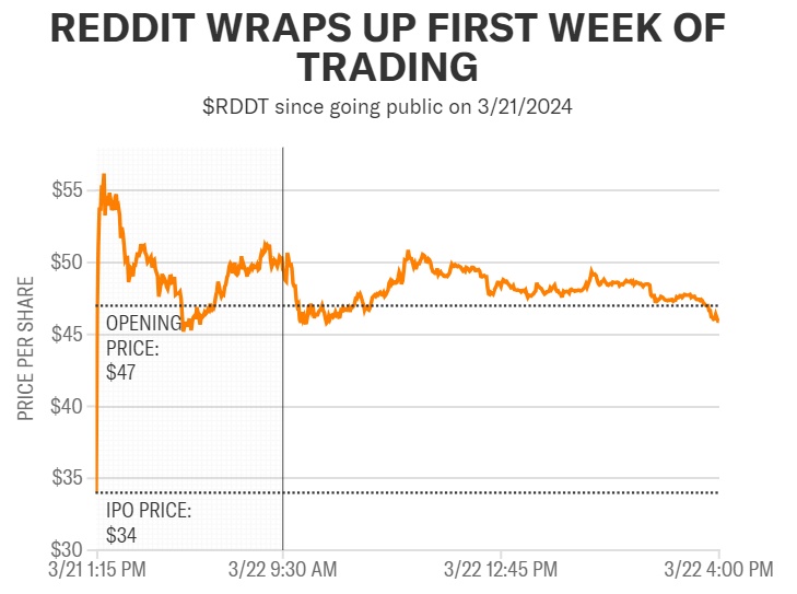在上周围绕美联储的喧嚣中,投资者还看到了一段时间以来最被炒作的IPO之一——Reddit(RDDT.US)周四开始在纽约证券交易所上市。上周五,这家社交媒体平台的股价收于45.94美元,使该公司的市值达到73亿美元。周三晚间,IPO定价为每股34美元,净增7.48亿美元。早在2021年,Reddit融资4.1亿美元,估值超过100亿美元。