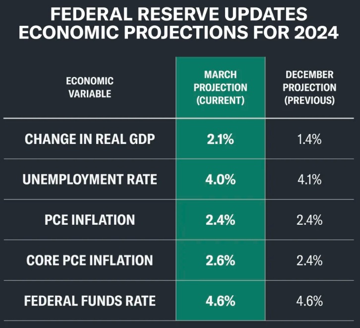 今年第一季度,美联储和投资者努力达成了一项共识。2024年伊始,投资者预计美联储今年将六次降息,即累计降息1.5%。美联储去年12月暗示,更有可能进行三次降息,即总共降息0.75%。在周三的声明之前,双方已经找到了共同点。美联储对市场“正确”的肯定将股市推至历史新高。随着美联储上调GDP预测,下调失业率预期,并保持利率预期不变,美联储或多或少对2024年的经济前景发出了“解除警报”的信号。