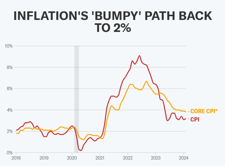 这与2023年底形成鲜明对比,当时通胀压力显示出回落至美联储2%目标的迹象。鲍威尔在第五次会议上维持利率不变后强调,让通胀回到目标水平将是一条渐进但坎坷的道路。他指出,今年迄今为止的价格数据既没有提振也没有削弱政策制定者的信心。