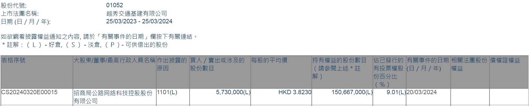 智通财经APP获悉,香港联交所最新资料显示,3月20日,招商公路增持越秀交通基建(01052)573万股,每股作价3.8230港元,总金额约为2190.58万港元。增持后最新持股数目为1.51亿股,最新持股比例为9.01%。
