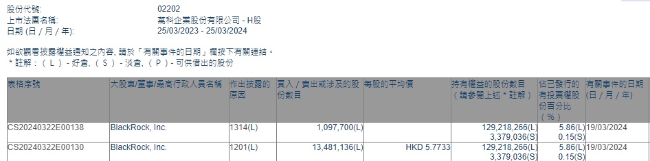 智通财经APP获悉,香港联交所最新资料显示,3月19日,贝莱德减持万科企业(02202)1348.1136万股,每股作价5.7733港元,总金额约为7783.06万港元。减持后最新持股数目为1.29亿股,最新持股比例为5.86%。