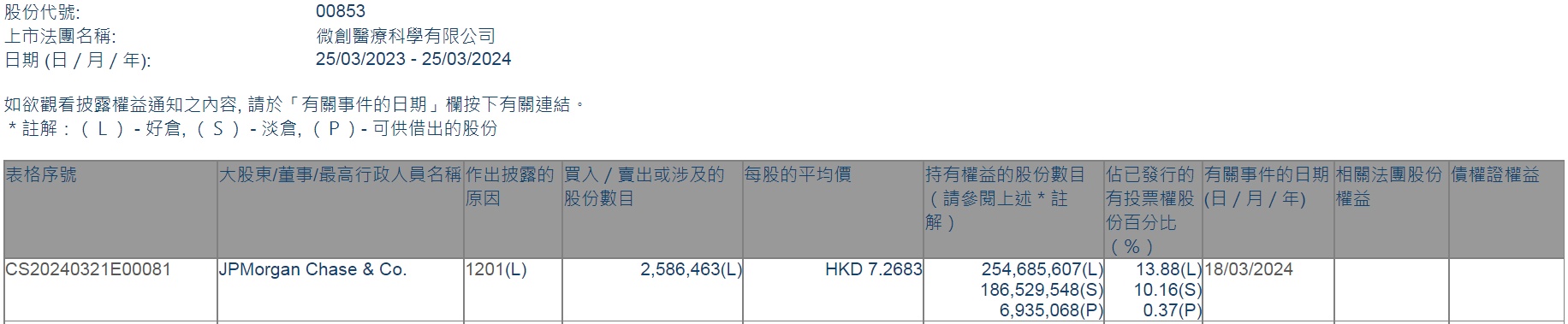 智通财经APP获悉,香港联交所最新资料显示,3月18日,小摩减持微创医疗(00853)258.6463万股,每股作价7.2683港元,总金额约为1879.92万港元。减持后最新持股数目约为2.55亿股,最新持股比例为13.88%。