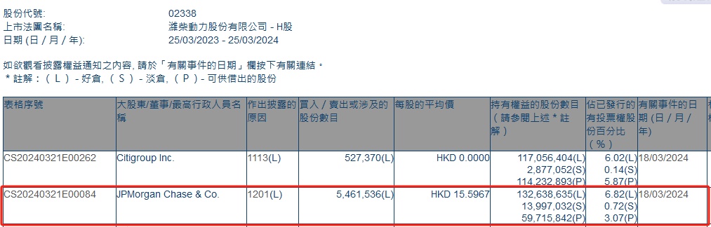 智通财经APP获悉,香港联交所最新资料显示,3月18日,小摩减持潍柴动力(02338)546.1536万股,每股作价15.5967港元,总金额约为8518.19万港元。减持后最新持股数目约为1.33亿股,最新持股比例为6.82%。
