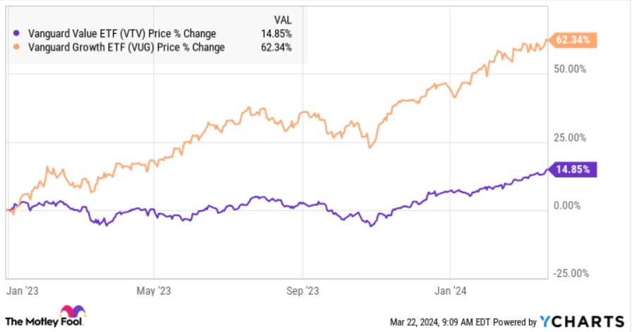 此外,美股市场的价值型股票近年来的表现明显落后于“七大科技巨头”所主导的成长型股票。事实上,自2023年初以来,“先锋成长型ETF” (代码VUG)的表现比“先锋价值型ETF” (代码:VTV)高出惊人的47个百分点。