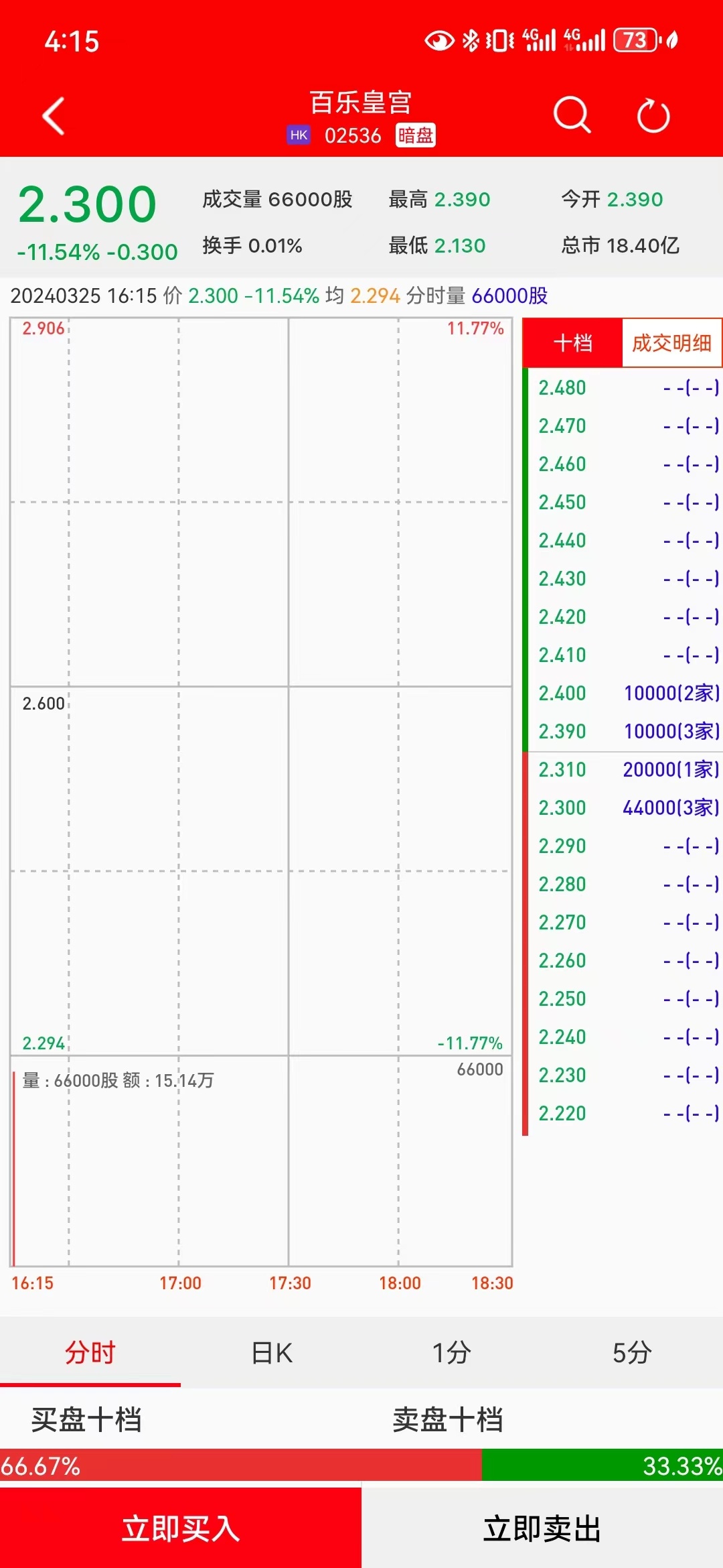 智通财经APP获悉,百乐皇宫(02536)将于3月26日(周二)在香港挂牌。截至发稿,利弗莫尔证券暗盘交易显示报价2.30港元,较招股价2.6港元下跌11.54%。每手1000股,不计手续费,每手亏300港元。