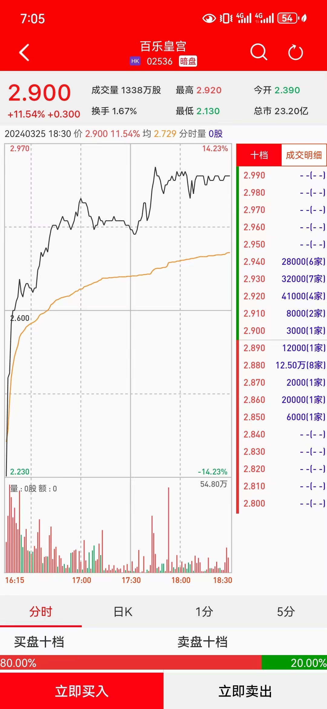 智通财经APP获悉,百乐皇宫(02536)将于3月26日(周二)在香港挂牌。截至收盘,利弗莫尔证券暗盘交易显示报价2.90港元,较招股价2.6港元上涨11.54%。每手1000股,不计手续费,每手赚300港元。