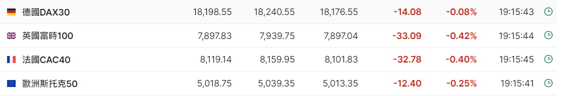 2. 截至发稿,德国DAX指数跌0.08%,英国富时100指数跌0.42%,法国CAC40指数跌0.40%,欧洲斯托克50指数跌0.25%。