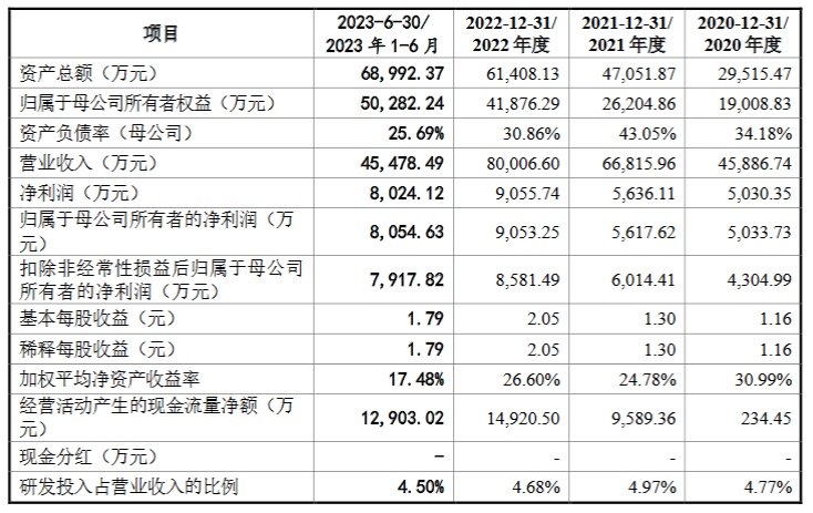 财务方面,于2020年、2021年、2022年以及2023年1-6月份,好博窗控实现营业收入4.59亿元、6.68亿元、8.00亿元、4.55亿元;同期,公司净利润分别为5030.35万元、5636.11万元、9055.74万元、8024.12万元。