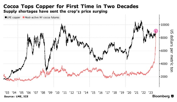 这一涨势已使可可价格推至接近1万美元,这在几个月前似乎是不可想象的水平,甚至使可可价格超过了工业金属中的“领头羊”铜价。