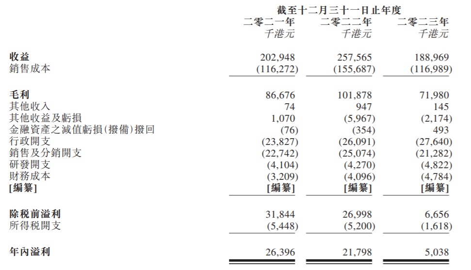 财务方面,于2021年度、2022年度、2023年度、优博控股的收益分别为约2.03亿、2.58亿、1.89亿港元;同期,实现年内溢利分别为2639.6万、2179.8万、503.8万港元。