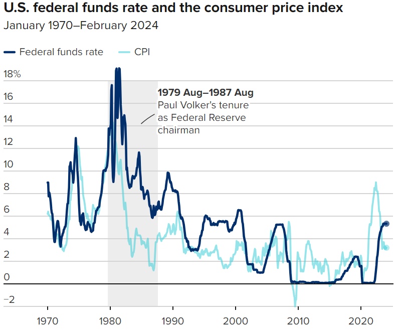 到1980年代初,长期高通胀已变得根深蒂固,以至于时任美联储主席保罗•沃尔克不得不采取更激进的措施来收紧货币供应。基准利率在1981年7月达到了创纪录的22.36%。基准利率是指银行之间隔夜拆借的利率,但也会影响到多种形式的消费者债务。目前的利率在5.25%-5.5%之间。
