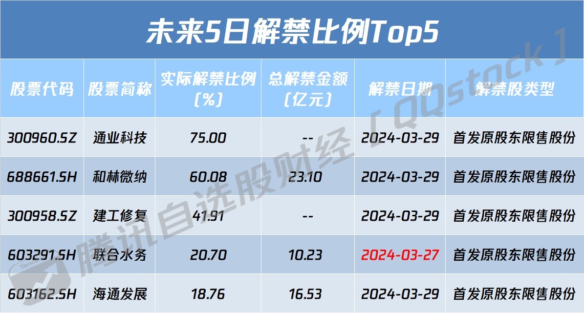 从解禁比例来看,未来5日通业科技实际解禁比例达75%,其次解禁比例居前的分别为和林微纳、建工修复。
