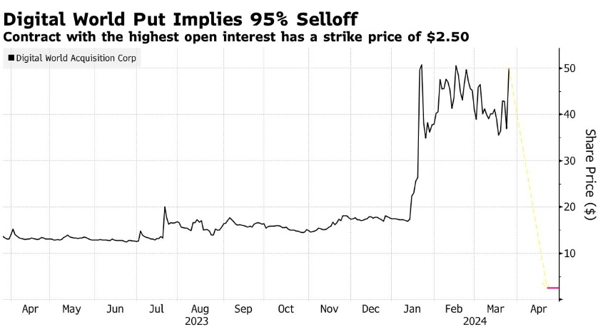 智通财经获悉,周一,为唐纳德•特朗普媒体公司提供上市服务的空头支票公司股价飙升,同时,防止该公司股票在短短几周内几乎失去全部价值的期权也广受追捧。在Digital World Acquisition Corp.(DWAC.US)飙升35%至49.95美元的同时,交易员们抢购了1.5万多份4月19日到期的2.50美元看跌期权,相当于押注150万股该公司股票股价届时暴跌95%。