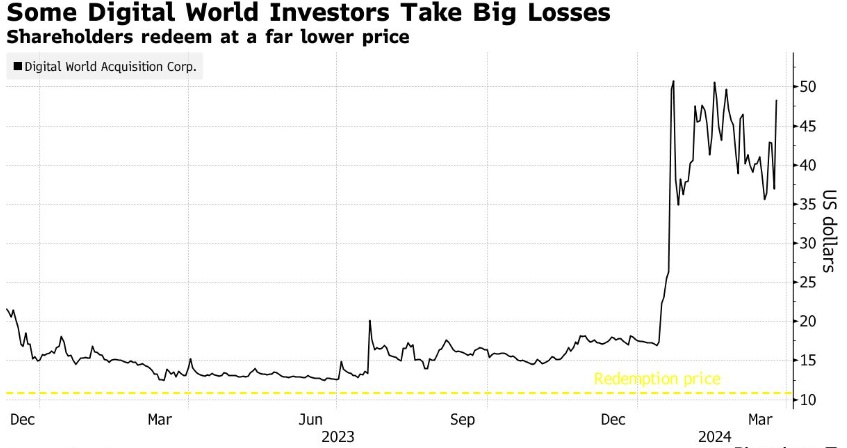 值得注意的是,DWAC的一些投资者在股东投票通过为特朗普媒体公司提供借壳服务前自愿退出交易,损失了75%。根据上周五的一份文件,在投票批准这家特殊目的收购公司将特朗普媒体公司上市的交易之前,近5000股DWAC股票以每股10.87美元的价格赎回。自2021年10月宣布与特朗普媒体结盟以来,SPAC的股价从未低于赎回价值。