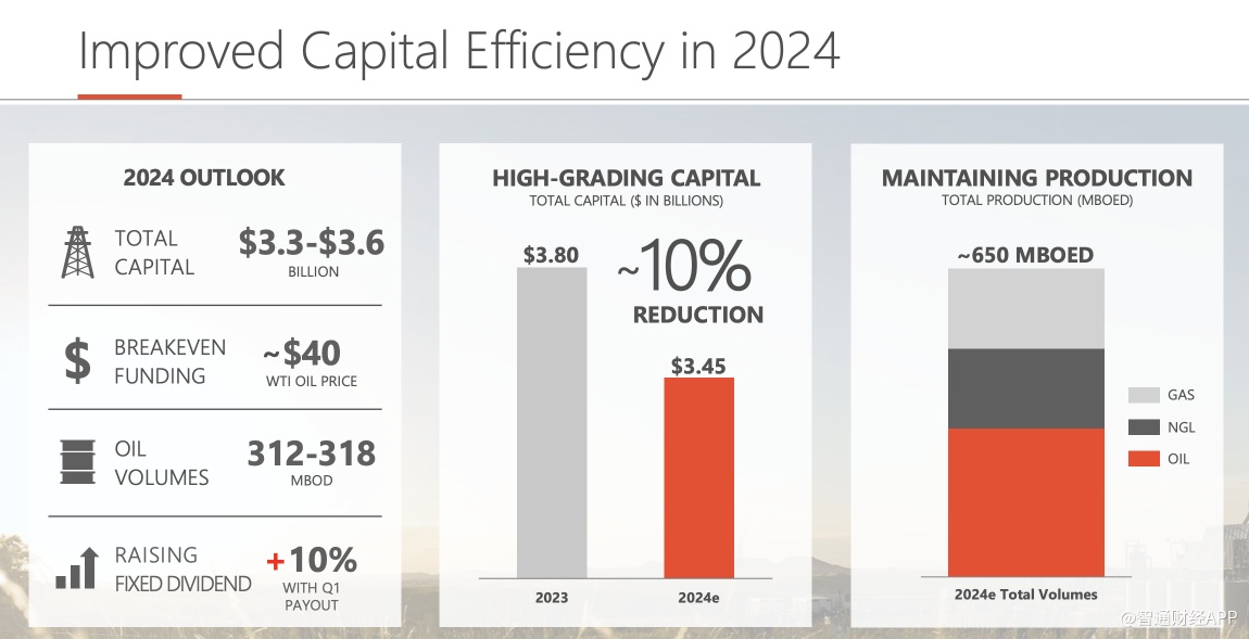 根据2024年指引,戴文能源目前预计产量将保持不变。令人印象深刻的是,该公司计划以低于预期的支出来实现这一目标。管理层预计,2024年的资本支出将在33亿至36亿美元之间。按中间值计算,这应该比该公司去年38亿美元的支出低10%左右。该公司预计将产生的额外现金流用于回报股东,并可能用于减少债务。事实上,管理层已经宣布,从今年第一季度开始,固定股息将提高10%。