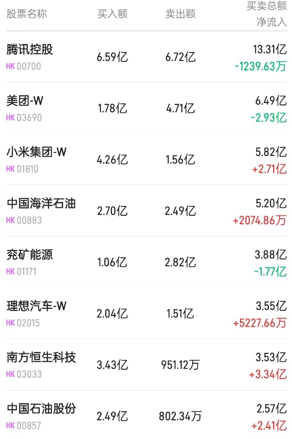 北水净买入最多的个股是南方恒生科技(03033)、腾讯(00700)、小米集团-W(01810)。北水净卖出最多的个股是兖矿能源(01171)、汇丰控股(00005)。