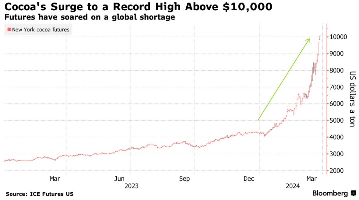 智通财经APP注意到,可可期货价格飙升至前所未有的每吨1万美元以上,延续了今年价格已经翻了一番的历史性涨势,这也推高了巧克力的成本。