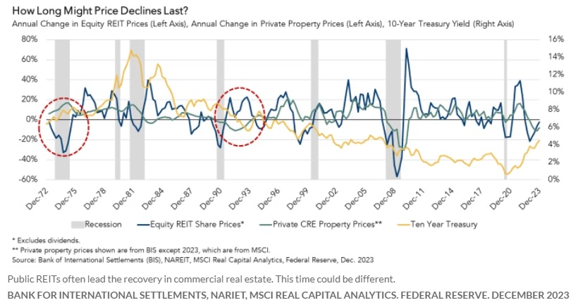 房地产投资信托基金(REITs)在过去50年中的大部分时间里一直引领着市场从底部反弹——但并非总是如此。在1970年代,当通胀加剧时,公共市场表现不佳,而私人商业地产价格上涨。但在1990年代初,紧随储蓄贷款危机之后,公共市场价格带头高涨。