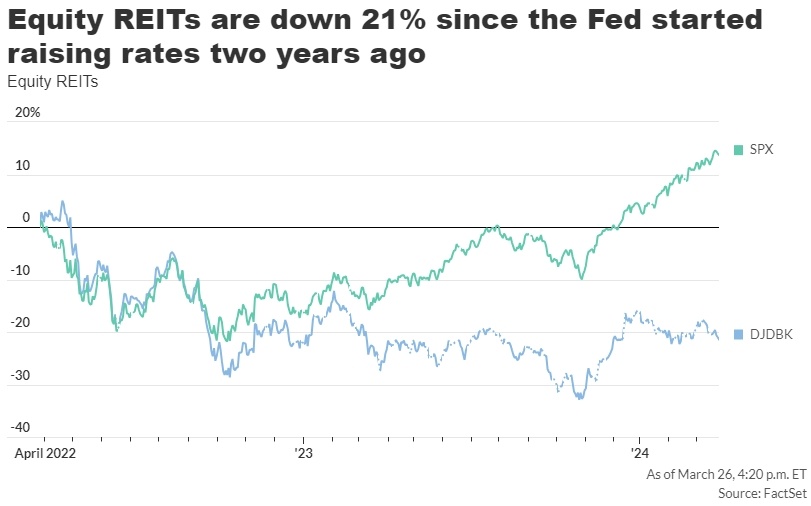 道琼斯市场数据显示,标普500指数在过去五个月中大幅走高,有望创下2019年以来的最佳第一季度业绩。自美联储两年前开始将利率从接近于零的水平上调以来,该指数已攀升了14%,而REITs自2022年3月以来下跌了21%。