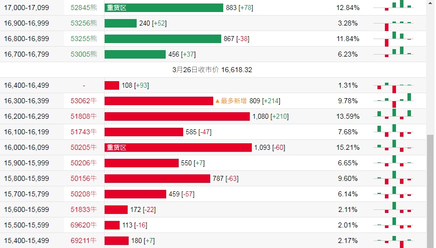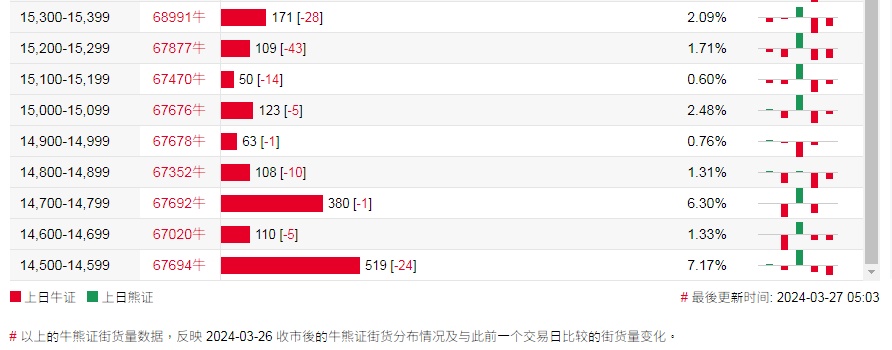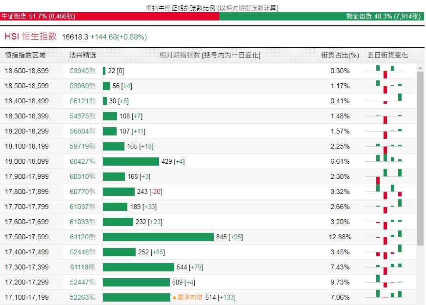 牛证街货重货区在16000-16099区间,该区间最新熊证数量为1093张,较上一交易日减少60张;最多新增在16300-16399区间,该区间最新熊证数量为809张,较上一交易日增加214张。