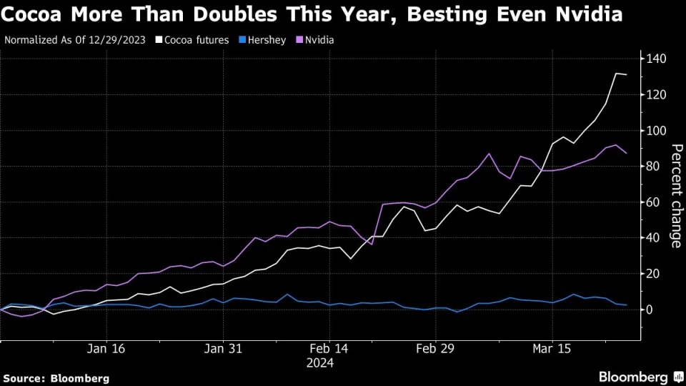 可可期货价格今年已上涨逾一倍,周二有史以来首次突破每吨1万美元大关,随后回吐涨幅,在历史性涨势中稍作喘息。与此同时,好时股价自1月初以来仅上涨2.4%,表现逊于标普500指数和大型消费必需品指数。
