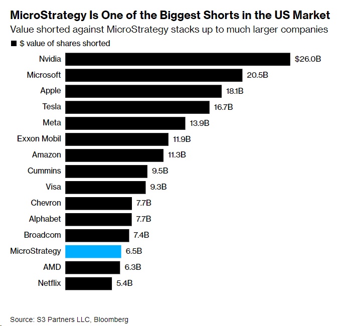 对MicroStrategy的空头头寸占其总流通股的20%以上。MicroStrategy目前是美国市场上被做空最严重的股票之一,做空规模与英伟达(NVDA.US)、微软(MSFT.US)和苹果(AAPL.US)等大公司相当。