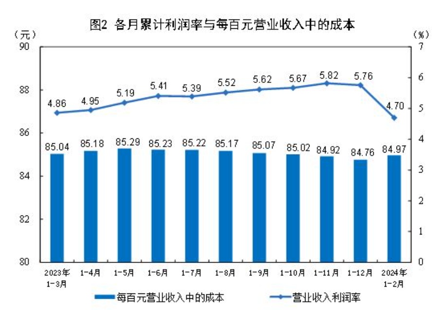 1—2月份,规模以上工业企业每百元营业收入中的成本为84.97元,同比增加0.11元;每百元营业收入中的费用为8.62元,同比减少0.01元。
