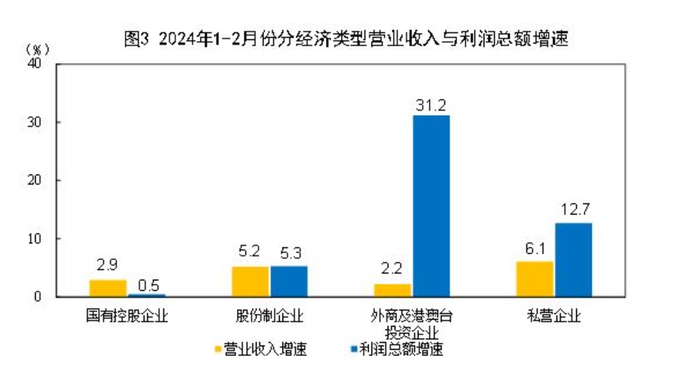 1—2月份,规模以上工业企业中,国有控股企业实现利润总额3434.9亿元,同比增长0.5%;股份制企业实现利润总额6898.5亿元,增长5.3%;外商及港澳台投资企业实现利润总额2169.2亿元,增长31.2%;私营企业实现利润总额2465.4亿元,增长12.7%。