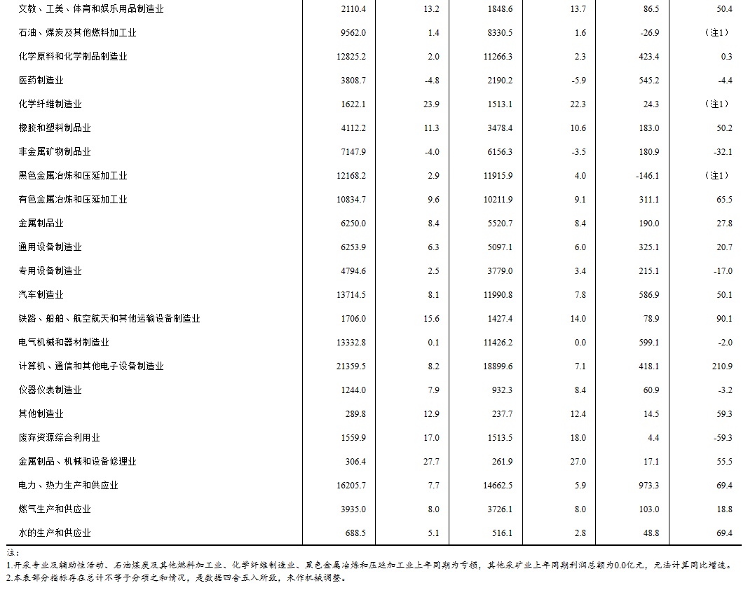 1—2月份,主要行业利润情况如下:计算机、通信和其他电子设备制造业利润增长2.1倍,电力、热力生产和供应业增长69.4%,有色金属冶炼和压延加工业增长65.5%,纺织业增长51.1%,汽车制造业增长50.1%,通用设备制造业增长20.7%,石油和天然气开采业增长1.8%,化学原料和化学制品制造业增长0.3%,煤炭开采和洗选业下降36.8%,非金属矿物制品业下降32.1%,专用设备制造业下降17.0%,农副食品加工业下降7.3%,电气机械和器材制造业下降2.0%,石油煤炭及其他燃料加工业和黑色金属冶炼和压延加工业亏损均增加。