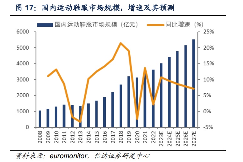 复盘国内运动鞋服市场,大致分为三个阶段:2001年到2010年为高速发展期,大众消费能力显著提升叠加奥运会等赛事带来的运动热潮,本土运动鞋服品牌迅速发展。2011 年至 2013 年为行业停滞期,受次贷危机等原因影响,运动鞋服行业增速放缓;2014年之后为稳健增长期,虽然受疫情影响2020年发展有所停滞,但疫情后时代之后在政策推动、居民收入提升等多重因素推动下,行业稳步复苏,2021年市场规模同增13.66%至3549.47亿元,2022年同比微增,预计2023-27年行业规模将以5%-12%的增速稳定增长。