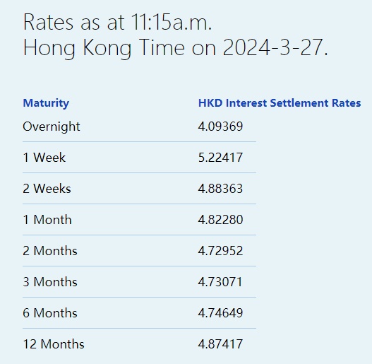 智通财经APP获悉,3月27日,港元拆息全线下跌,其中,隔夜拆息大跌45基点至4.09369%,见逾一周新低,两周拆息未能守稳5%,而与楼按相关的一个月拆息亦微降至4.8228%。