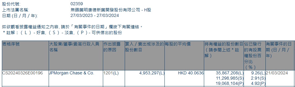 智通财经APP获悉,香港联交所最新资料显示,3月21日,小摩减持药明康德(02359)495.3297万股,每股作价40.0636港元,总金额约为1.98亿港元。减持后最新持股数目约为3586.72万股,最新持股比例为9.26%。