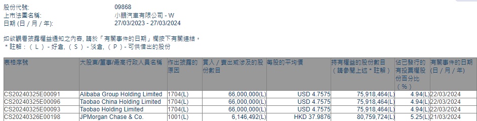 智通财经APP获悉,香港联交所最新资料显示,3月21日,摩根大通增持小鹏汽车(09868)614.6492万股,每股作价37.9876港元,总金额约为2.33亿港元。增持后最新持股数目约8075.97万股,最新持股比例为5.25%。