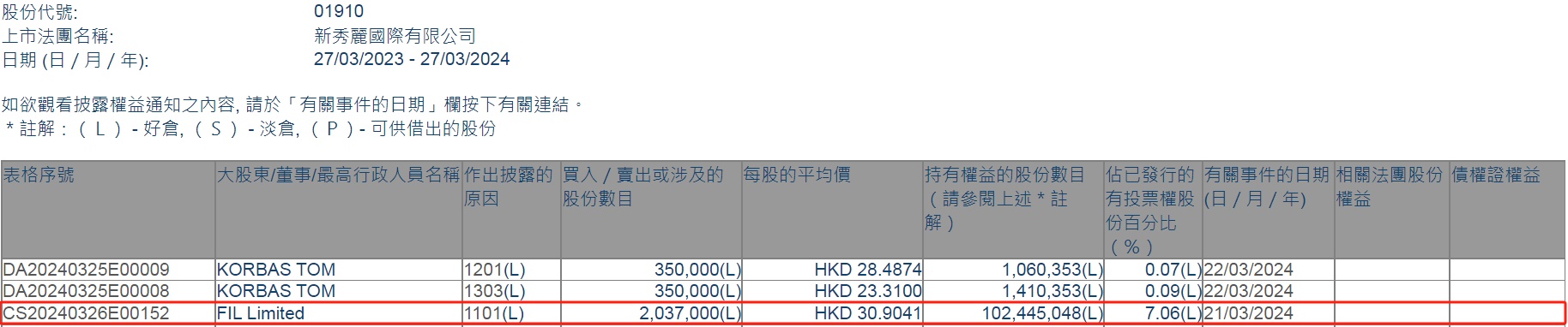 智通财经APP获悉,香港联交所最新资料显示,3月21日,富达国际增持新秀丽(01910)203.7万股,每股作价30.9041港元,总金额约为6295.17万港元。增持后最新持股数目约为1.02亿股,最新持股比例为7.06%。