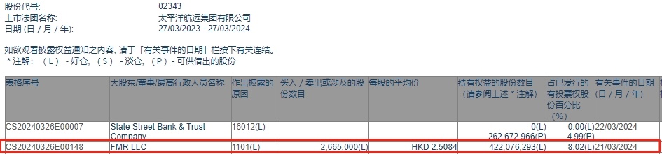 智通财经APP获悉,香港联交所最新资料显示,3月21日,FMR LLC增持太平洋航运(02343)266.5万股,每股作价2.5084港元,总金额约为668.49万港元。增持后最新持股数目约为4.22亿股,最新持股比例为8.02%。