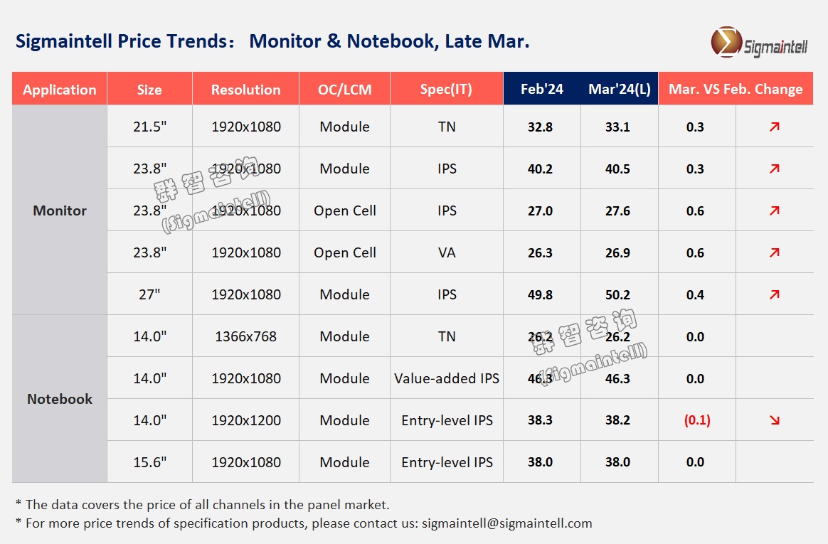 23.8"FHD,3月 Open cell面板价格预计上涨0.6$, LCM价格预计上涨0.3$;