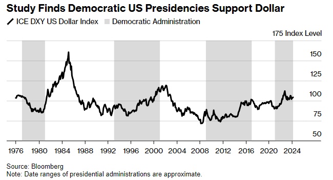 这项尚未经过同行评议的研究显示,在民主党执政期间,美元平均每年升值4.2%,而在共和党执政期间则下跌1.3%。在特朗普的第一个任期内,美元在贸易加权基础上下跌了10%。