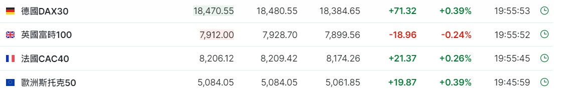 2. 截至发稿,德国DAX指数涨0.39%,英国富时100指数跌0.24%,法国CAC40指数涨0.26%,欧洲斯托克50指数涨0.39%。