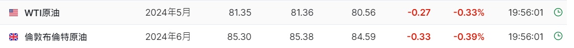 3. 截至发稿,WTI原油跌0.33%,报81.35美元/桶。布伦特原油跌0.39%,报85.30美元/桶。