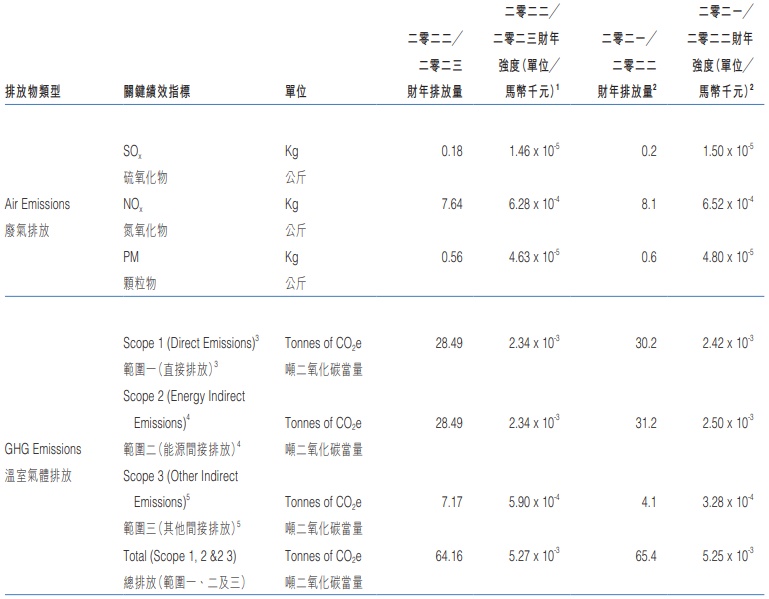 在环境方面,于2023年,该集团的资源消耗主要包括电力、水、汽油及纸张,排放的主要来源是运输车辆和电力消耗的温室气体排放,以及办公室员工产生的商业固体废弃物和废水。与2022年财政年度相比,该集团的各项污染物的排放量均维持在稳定水平。温室气体排放量与2022年财年略有不同,范围1(直接排放)和范围2(能源间接排放)的排放均有所减少,而范围3(其他间接排放)的排放因疫情过后商务出行恢复,由4.08吨二氧化碳当量上升至7.17吨二氧化碳当量。