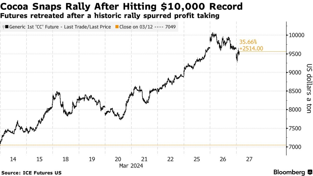 今年以来,由于西非主要种植国的作物欠佳,可可期货价格翻了一番多,导致全球可可供应连续第三年出现短缺。截至发稿,纽约的可可期货跌至每吨9,664美元,而伦敦的可可期货下跌了近2%。