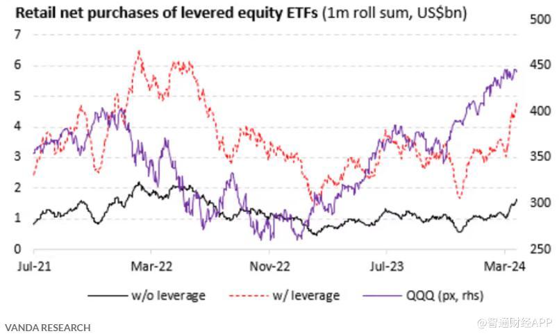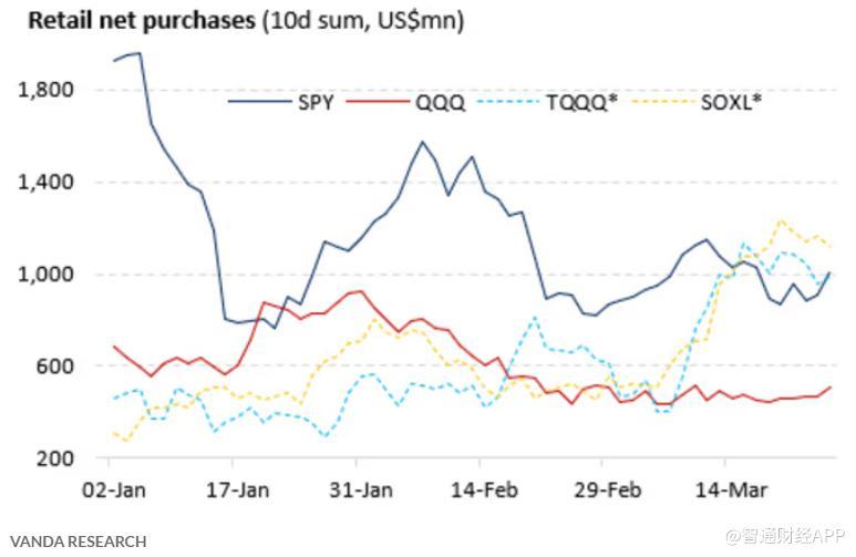 然而,他们指出,最近几周个人投资者使用杠杆的情况“明显增加”。自年初以来散户资金流入四个被购买最多的交易所交易基金为标普500指数ETF(SPY.US)、纳指100 ETF(QQQ.US)、3倍做多纳指ETF(TQQQ.US)和3倍做多半导体ETF(SOXL.US)。