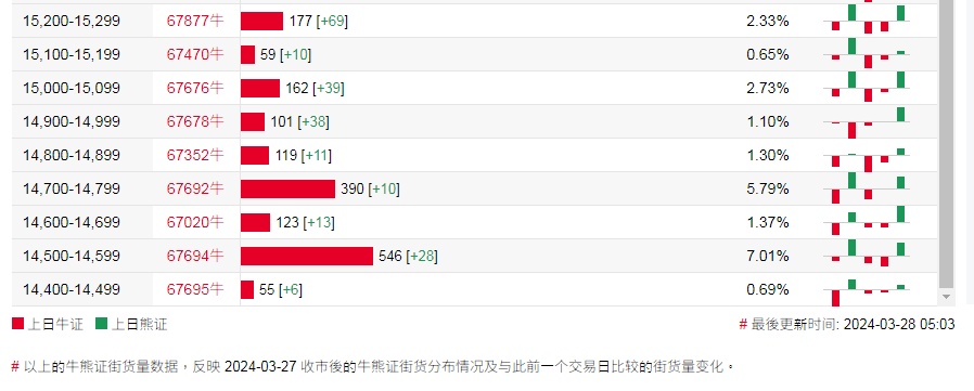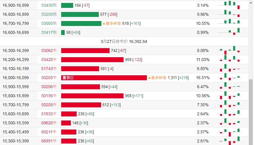 牛证街货重货区和最多新增皆在16000-16099区间,该区间最新熊证数量为1311张,较上一交易日增加218张。