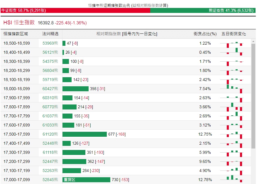 法兴恒指牛熊证街货分布图中的数据显示,熊证街货重货区在17000-17099区间,该区间最新牛证数量为730张,较上一交易日减少153张;最多新增在16700-16799区间,该区间最新牛证数量为618张,较上一交易日增加161张。