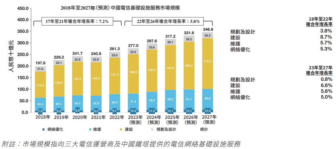 中国电信基础设施服务行业的整体市值由2018年约人民币1,978亿元增长至2022年约人民币2,613亿元,复合年增长率约7.2%,由大规模4G及5G基础设施建设服务需求主导。整体市值估计将由2023年约人民币2,770亿元增加至2027年约人民币3,468亿元,复合年增长率约5.8%。基础设施建设服务在可见将来将继续成为市场的主要驱动力。